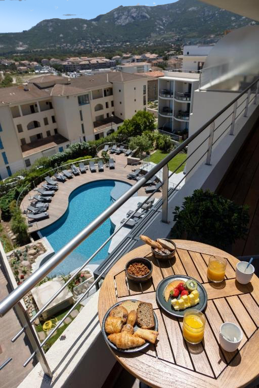 La situation sur les hauteurs dominant la baie de Calvi offre point de vue exceptionnel. Depuis terrasses des chambres ou rooftop bar, le regard embrasse ville de Calvi, sa citadelle génoise, la plage de sable fin, la pinède, les montagnes du Monte Grossu en arrière-plan. Cette vue à trois cent soixante degrés sur sites emblématiques de Balagne constitue atout majeur de l’établissement. Les chambres, toutes dotées d’espace extérieur aménagé, déclinent vues sur piscine, citadelle, mer partielle ou panoramique selon catégories.